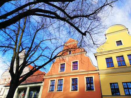 A beautiful shot of a tree silhouette with colored buildings in the background in Stargard, Poland.