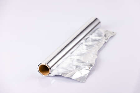 Roll of aluminum foil on a white background, close-up.