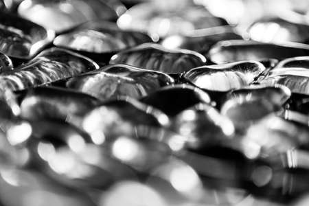 Black and white close up photograph of glass stones reflecting the light