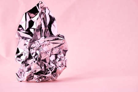 Geometric composition with crumpled foil against a purple and pink background. A piece of aluminum foil for food packaging with an uneven jagged edge. Top view. Copy space.