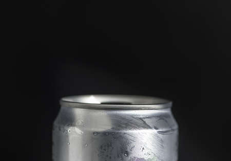 A wet can of a cold and tasty drink. Water drops on the metal surface of the metal container. Dark background.