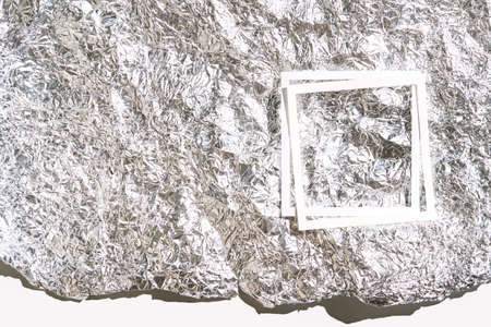 Trend sunny foil mockup. White paper. Congratulations metal card. Aerial view. Zero waste template. Modern border concept. Eco sostainable texture. Steel rough art. DIY aluminium effect