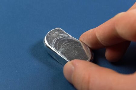 A bar of aluminum in his hand. Spilled aluminum ingot