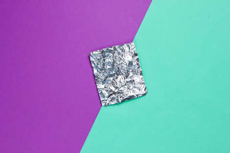 A piece of foil on colored paper background. Top view. Minimalism concept