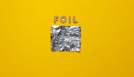 A piece of foil on a yellow background with the word foil of wooden letters