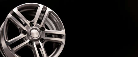 silver new alloy wheel with bifurcated beams on a black background, copy space, long panoramic