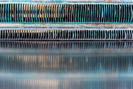 Old heating exchanger with reflection on metallic table as background
