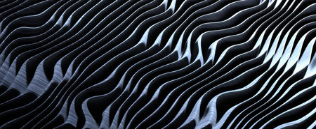 Wavy abstract stripes with metallic gradient background. Futuristic 3d render aluminum warp waves black and white striped color. Textured ripples with transitions and elegant steel tracery