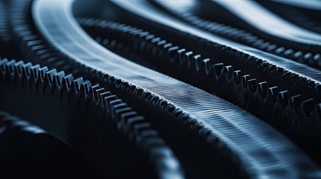 A high-quality shot of a car's timing belt, showing its grooves and rubberized texture in detail.