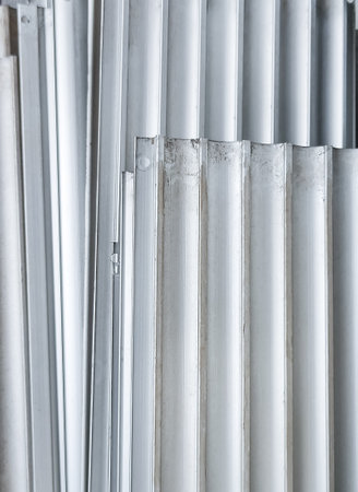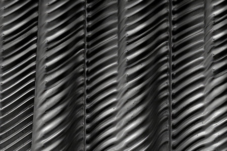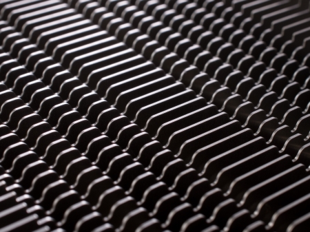This close-up image showcases the detailed structure of metal fins in an industrial heat exchanger. The abstract pattern highlights the sleek design and functional elements essential for efficient cooling and performance.
