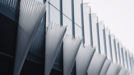 Horizontal shot abstract buildings with white metallic ribs and glass windows. Generative AI AIG21.