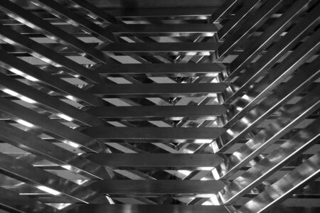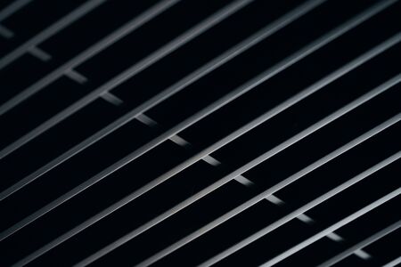 Office grille ceiling. Modern black metal grille ceiling, suspended covering. Abstract design texture.