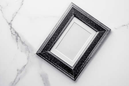 Photo album, artwork mock up, vintage design concept - Black wooden frame on marble, flatlay