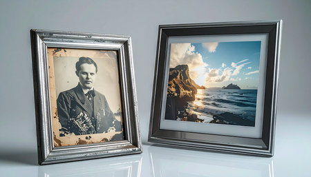 Two silver frames stand side-by-side, creating a powerful visual narrative. One holds a vintage portrait of an ancestor, a link to the past and family history.