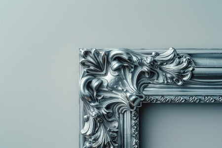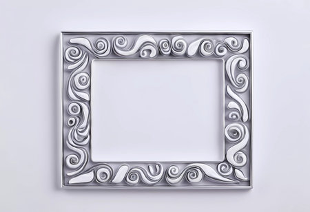 A stylish rectangular frame crafted from silver with an ornamental design rests on a smooth white grey backdrop. This frame is perfect for displaying treasured artworks or memories.