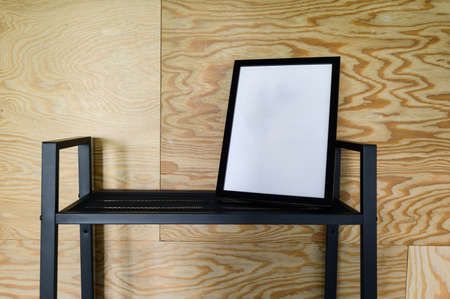 Modern panel for poster on a table of office room. Minimalist black frame mockup on white background for the design of advertisements. Square frame against a wall.