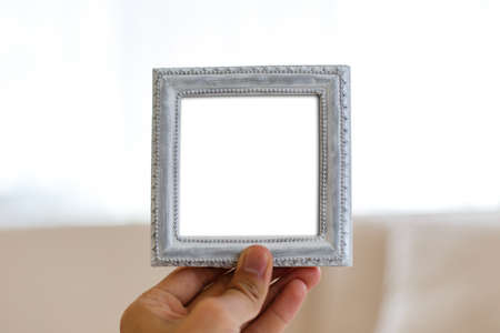 Close up detailed front view of white blank wooden frame with copy space, holding on man hand.