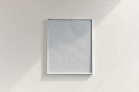 3d rendering of a white picture frame hanging on a white wall