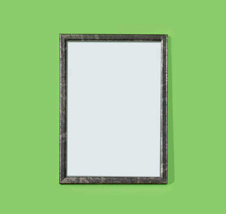 Green wooden frame on monochrome background. Simple mockup for design. Copy space for your text.