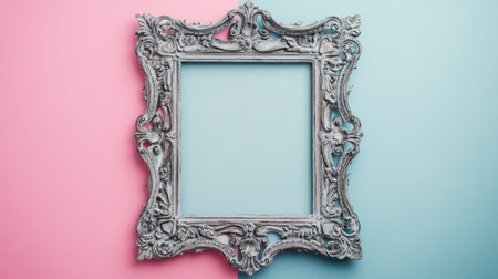 An ornate vintage frame rests against a soft pink and blue background, creating a striking contrast. Ideal for art displays, creative projects, or photography needs.