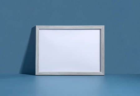 Blank picture frame leaning against blue wall. Invitation mockup, long shadow.