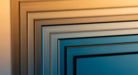 Layered frames in metallic silver beige and blue tones with warm light casting shadows creating depth.