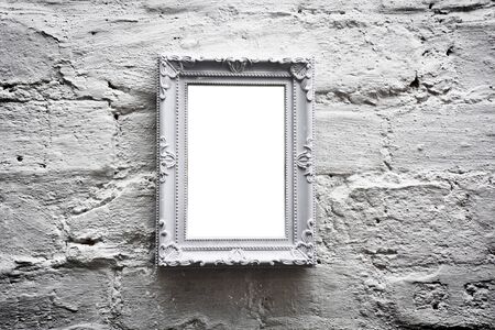 White empty frame with free copy space on white grunge brick wall. Grunge picture.