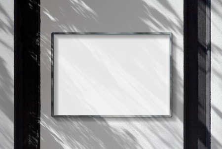 Metal frame hanging in street mockup. Template of a picture framed on a wall bathed in sunlight and shadows 3D rendering