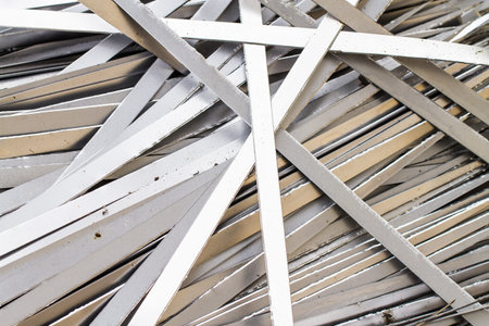 Aluminium profile manufacturing. Structural metal aluminium shapes. Aluminium profiles texture for constructions. Aluminium constructions factory background.