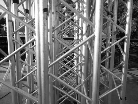 Metal pants. Metal structures for stage installation lie on pavement.