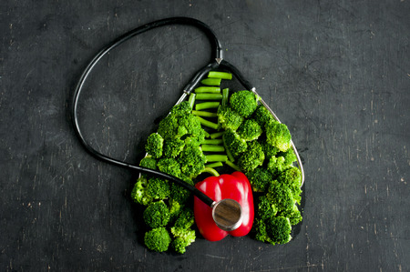 Diagnosis of heart condition. The broccoli, asparagus, pepper repeat the shape of the human heart and lungs, flat lay on dark background.