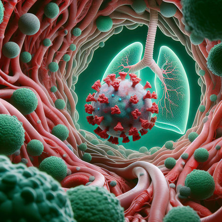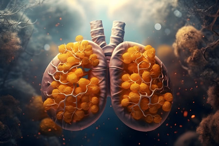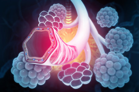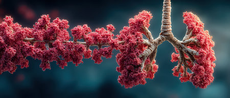 A vibrant, artistic rendering of the human lungs with visible airways and alveoli, highlighted with soft lighting to emphasize the respiratory system