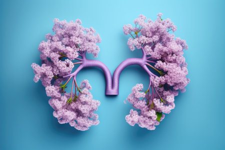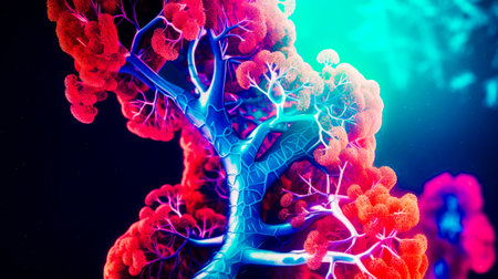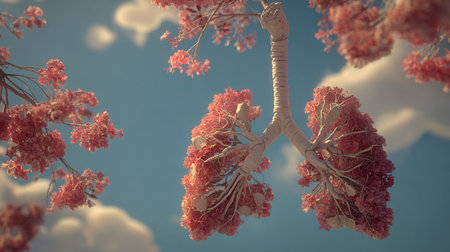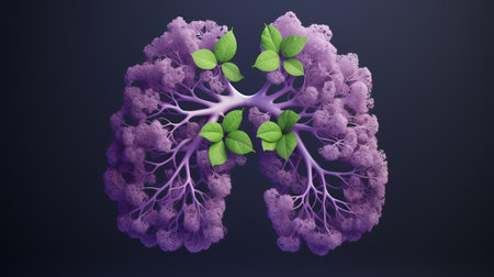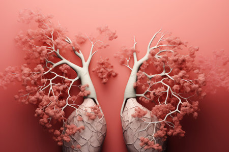 An artistic visualization features a pair of human lungs, with elaborate branching structures resembling trees. This imaginative depiction highlights the intricately anatomical details and textures
