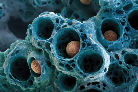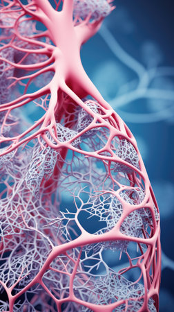Microscopic view of pulmonary alveoli diffusing oxygen and carbon dioxide through capillaries, illustrating respiratory function and gas exchange within the human body
