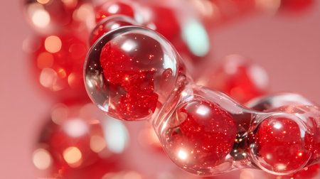 This image showcases vivid red molecules encased in transparent bubbles, reflecting light and creating an eye-catching composition suitable for scientific themes.