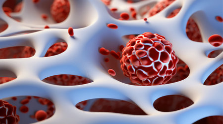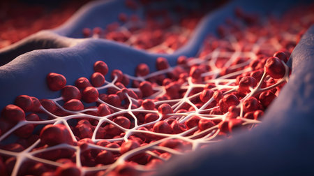 Transparent red blood vessels with glowing particles inside, showing detailed microscopic biological structure in blue background
