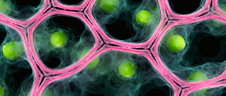 Abstract close up of green cells enclosed in pink network structures with smoky textures and dark background for science themes.