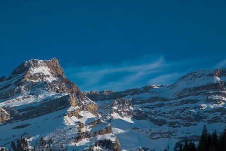 Beautiful early winter panorama of Oldenhorn mountain above Les Diablerets village in Switzerland on a sunny day.