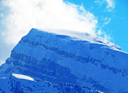 Snow-capped alpine peak Schibenstoll (2235 m) in the Churfirsten mountain range, between the Toggenburg region and Lake Walensee or Lake Walenstadt - Obertoggenburg, Switzerland (Schweiz)