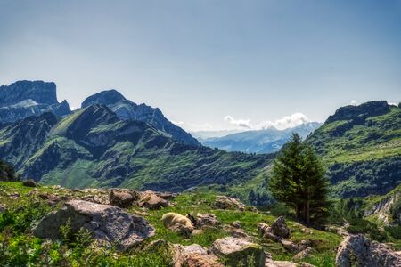 summer hikking in the swiss mountains, green grass and sunny day. Switzerland