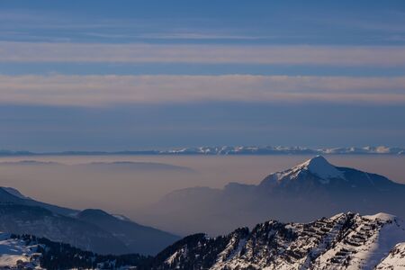 Beautiful mountain panorama from Leysin range on a cloudy winter day. Looking towards Lac Leman and Lausanne.