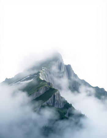 Mountain landscape with fog and clouds on a white background. Copy space.
