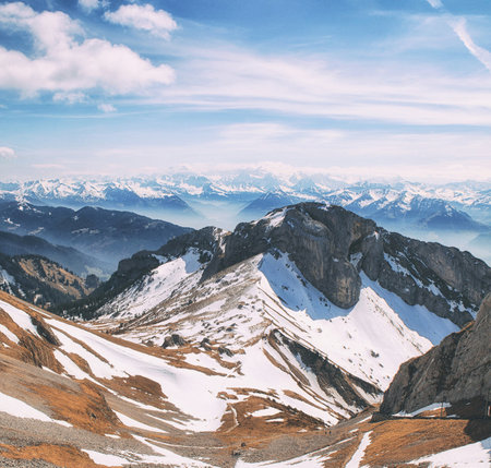 Majestic mountain view from the top of the Swiss Alps. Clear, high quality, no people, copy space
