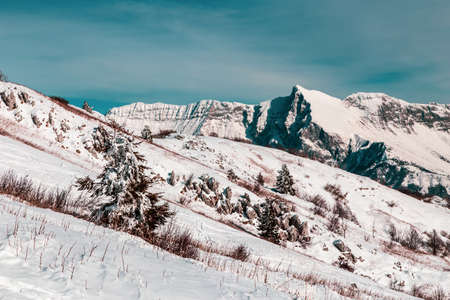 Beautiful day in French alps near small town called Megeve. Winter time in france, snow on mountains, beautiful scenic view.
