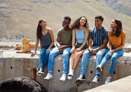 Taking a break from technology together. a happy group of friends sitting in a row on a fence together.