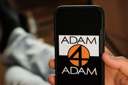 Adam4Adam logo on the screen of smartphone in mans hand laying on the sofa. Application for dating, June 2021, San Francisco, USA