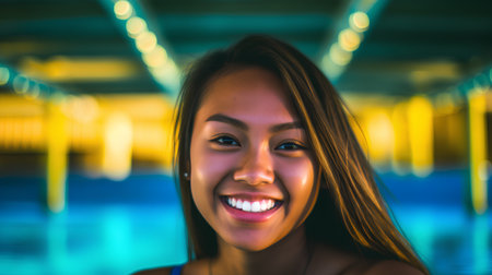 Portrait of a beautiful asian woman smiling and looking at the camera in the swimming pool