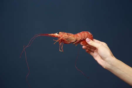 Close up of female hand holding fresh raw red langoustine, lobster, prawn or scampi on blue background. Seafood for a healthy diet. copy space.