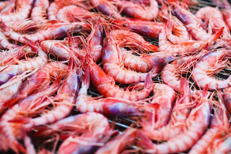 Fresh shrimps Gambos on grill close-up outdoors