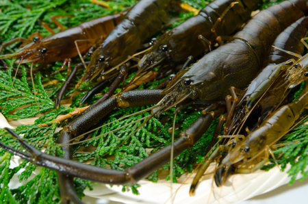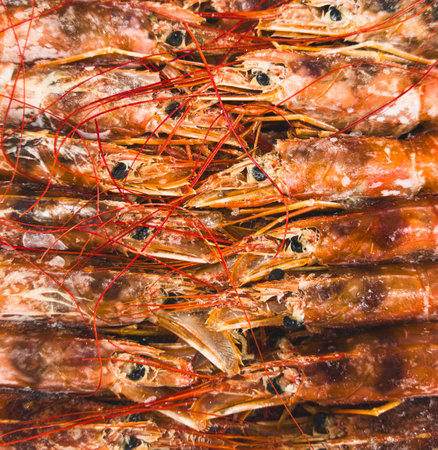 big shrimp red long legs row sea food delicious delicacy close-up